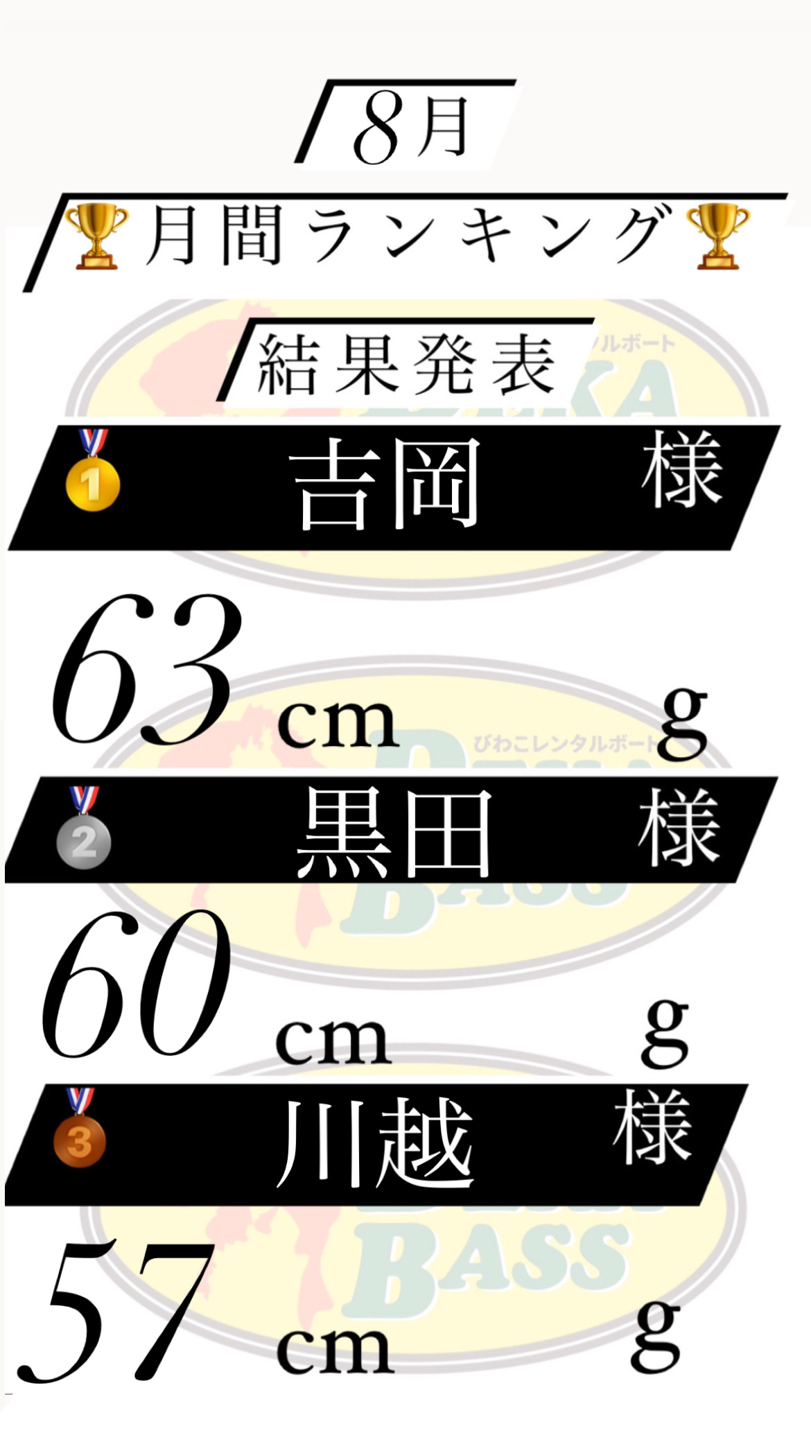| コメント | 8月🗓 月間ランキング🏆結果発表〜! 🥇吉岡様 63cm 🥇黒田様 60㎝ 🥉川越様 57㎝ 入賞おめでとうございます👏🏼🎊 8月も沢山のご来店と 釣果報告ありがとうございました🙇♀️ 【9月の営業時間】 受付開始 5:30 帰着時間 17:00 | ||