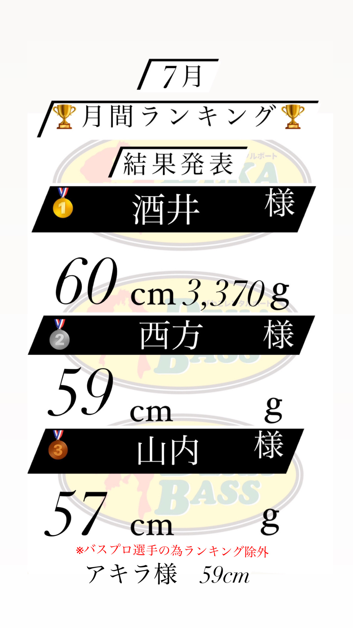 | コメント | 7月🗓 月間ランキング🏆結果発表〜! 🥇酒井様 60㎝3,370g 🥇西方様 59㎝ 🥉山内様 57㎝ ※バスプロ選手の為ランキング除外 アキラ様 59cm 入賞おめでとうございます👏🏼🎊 7月も沢山のご来店と 釣果報告ありがとうございました🙇♀️ 7/15(土)〜8/20(日) 店名リニューアル&コラボ(BunBun) キャンペーン‼︎ ブンブンクラブ会員様限定‼︎ 全艇対象🔥【2,000割引】🔥 🔴DEKABASSへご来店の際受付にて ブンブンクラブ会員証 又はブンブンアプリの会員証をご提示ください ※魚探料金は対象外 ※他の割引との併用はできません 是非お得なキャンペーンを利用してデカバスを釣ろう🎣 【6月〜8月の営業時間】 受付開始 5:00 帰着時間 17:00 | ||