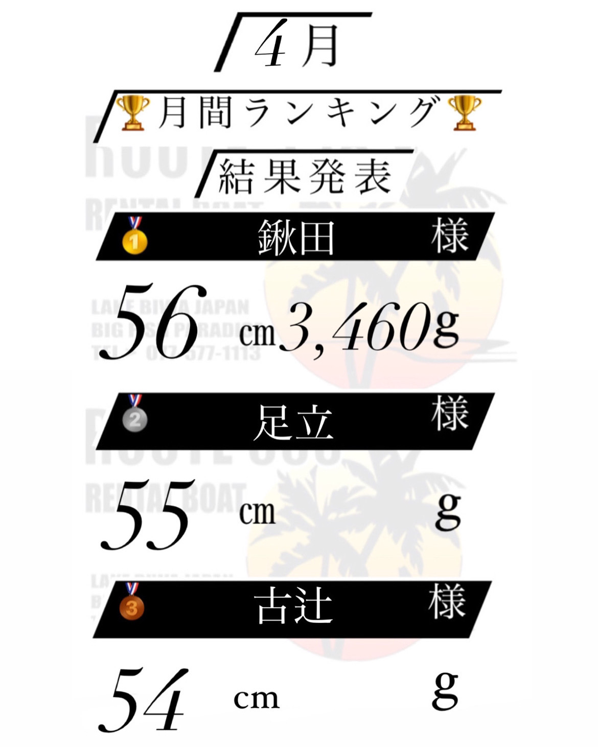| コメント | ROUTE558です! 4月🗓 月間ランキング🏆結果発表〜! 🥇鍬田様 56㎝3,460g 🥇足立様 55㎝ 🥉古辻様 54㎝ 入賞おめでとうございます👏🏼🎊 4月も沢山のご来店と 釣果報告ありがとうございました🙇♀️ 今月も皆様のご来店を心よりお待ちしております😊 【5月の営業時間】 受付開始 5:30 帰着時間 17:00 | ||