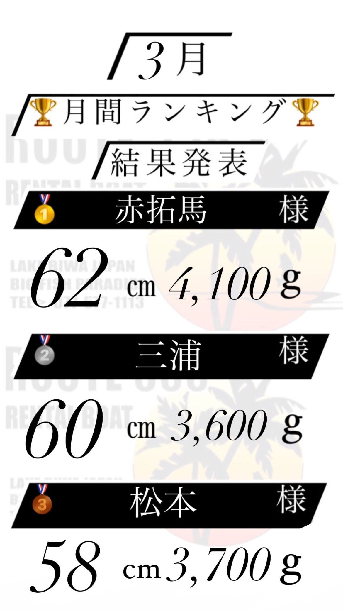 コメント ROUTE558です! 3月🗓 月間ランキング🏆結果発表〜! 🥇赤拓馬様 62㎝4,100g 🥇三浦様  60㎝3,600g 🥉松本様  58㎝3,700g 入賞おめでとうございます👏🏼🎊 すっかり暖かくなりよく釣れるシーズン 春になりましたね☺️ 3月も沢山のご来店と 釣果報告ありがとうございました🙇‍♀️ 今月もたくさんの皆様のご来店を心よりお待ちしております😊 【4月の営業時間】 受付開始 6:00 帰着時間 16:30