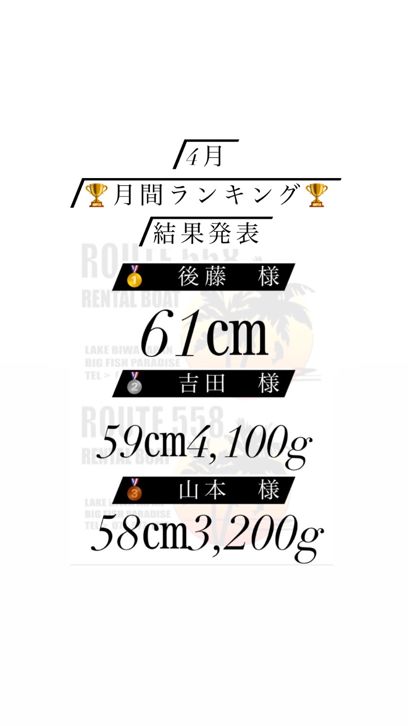 | コメント | こんにちは☀︎ROUTE558です! 4月🗓 月間ランキング🏆結果発表〜! 🥇61㎝ 🥈59㎝4,100g 🥉58㎝3,200g 入賞おめでとうございます👏🏼🎊 4月も沢山のご来店と釣果報告ありがとうございました🙇♀️ 5月もビックバス狙って沢山遊びに来てください😊お待ちしてます✨ | ||